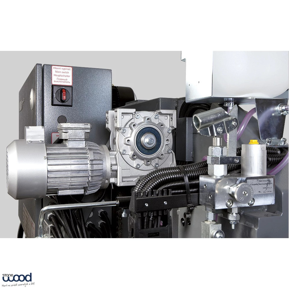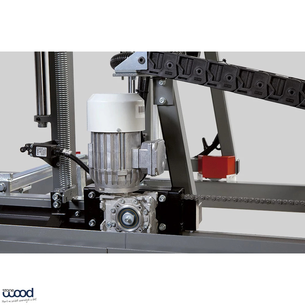 A masszív fűrészkar állítható keménykrómozott rudakon mozog, amelyek nagy pontosságot és hosszú élettartamot biztosítanak rendszeres kenés mellett. A függőleges mozgást kétoldalas szinkron lánchajtás végzi villanymotorral és csigahajtóművel, ami stabil és egyenletes pozicionálást tesz lehetővé. A vágásba és vissza történő mozgást frekvenciaváltóval vezérelt villanymotor biztosítja, így az előtolási sebesség folyamatosan szabályozható.
